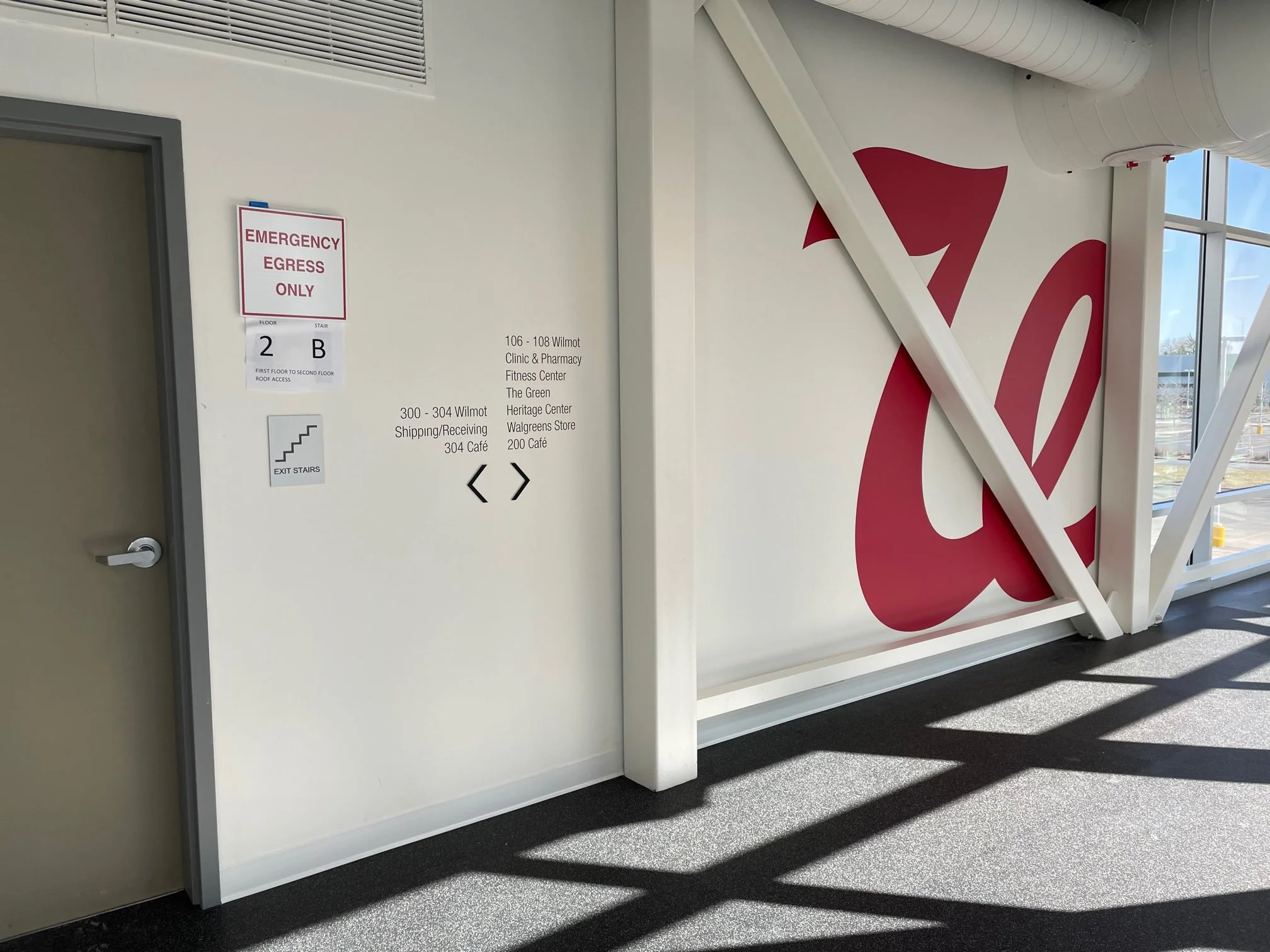 The brand-new skywalk on Walgreens’ campus connects three main buildings on the 10-building campus, requiring branding and wayfinding through the quarter-mile bridge.